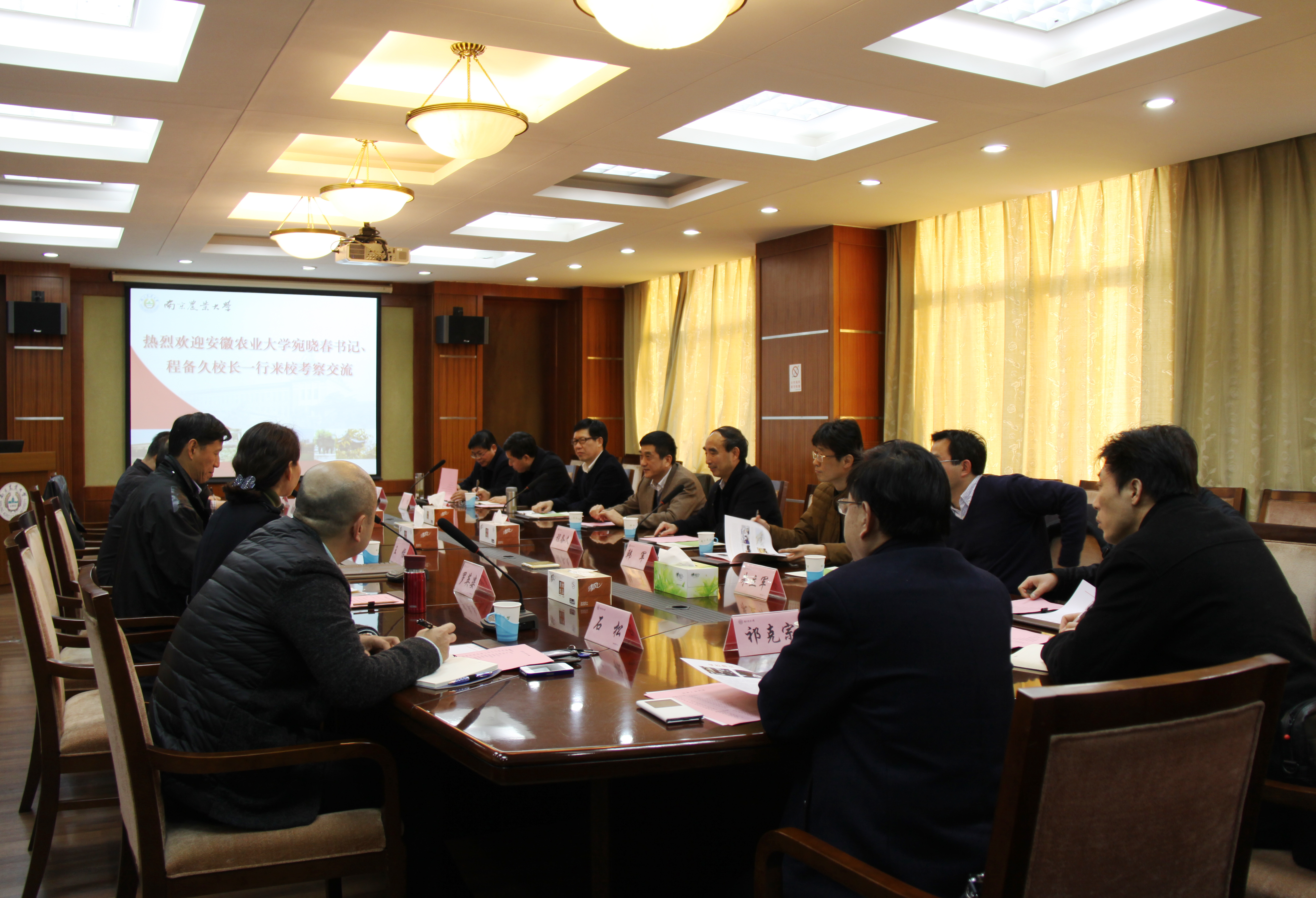 宛晓春对南京农业大学近年来改革发展取得的成就给予高度评价,特别在学科建设、人才队伍建设、科学研究和绩效考评管理等方面取得可喜的成果。程备久介绍了我校在人才培养、学科建设、平台建设、社会服务和国际交流与合作等方面工作实施情况和取得的成绩。他们指出,南京农大与我校地近缘亲,对我校发展给予了大力支持与帮助。我们要加强沟通与交流,学习和借鉴南京农大的经验与做法,为我校“十三五”规划编制与实施提供参考。他们强调,当前是推进“一流大学一流学科建设”、谋划“十三五”发展规划的的关键时期,要充分借鉴兄弟高校的成功经验和做法,强化顶层设计,全力推动学校各项事业发展取得新跨越。