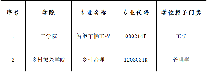 本网讯 近日,教育部公布了2024年度普通高等学校本科专业备案和审批结果,我校新增智能车辆工程、乡村治理2个本科专业。
