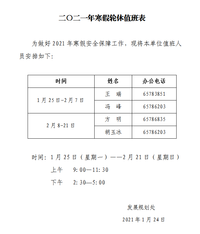 二〇二一年寒假轮休值班表