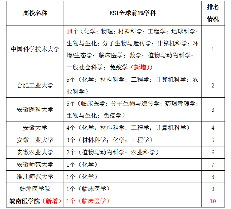 安徽高校进入ESI1%学科数据库情况(2020.01更新)